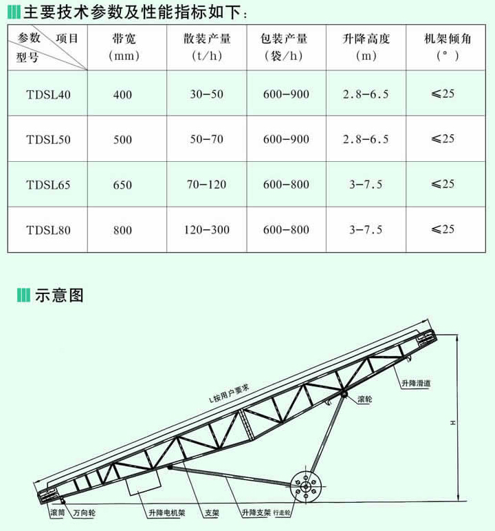 TDSL移動式升降皮帶輸送機可以散、包兩用,可任意移動作業(yè),室內外均可使用,具有快、慢兩種速度,以適應散運、包運的不同要求,提高設備利用率。機架采用鋼管彎曲或角鋼焊接而成,具有重量輕,移動靈活的特點。升降方式有手動或機動兩種,升降靈活方便,通過操作升降機械,可以調節(jié)輸送機的傾角及卸料點的高度。